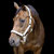 Doppelt gelegtes Gurthalfter mit mattierten Chrombeschlägen, edel designed mit Strasssteinen im Nasen-, Backen- und Genickbereich. Genick- und Nasenpadding aus synthetischem Kautschuk mit hautfreundlicher Nylonjersey-Oberfläche